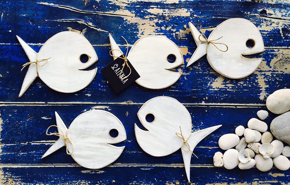 Od takrat naprej sem rezljala ribice za nakit. Pred štirimi leti pa sem začela izdelovati še dekorativne, unikatne in uporabne izdelke v obliki ribic: podstavek za kavico ali kozarce, podstavek za vročo posodo, deske za narezke, obešalnike za nakit in ključe, svečnike, inštalacije in razne druge dekoracije za dom. Seveda vse v obliki ribic, le srčki so še dodatni spremljevalci moje ribje ponudbe. Leta 2016 sem ponudbo razširila, sedaj tiskam tudi majice ter predpasnike z ribicami.