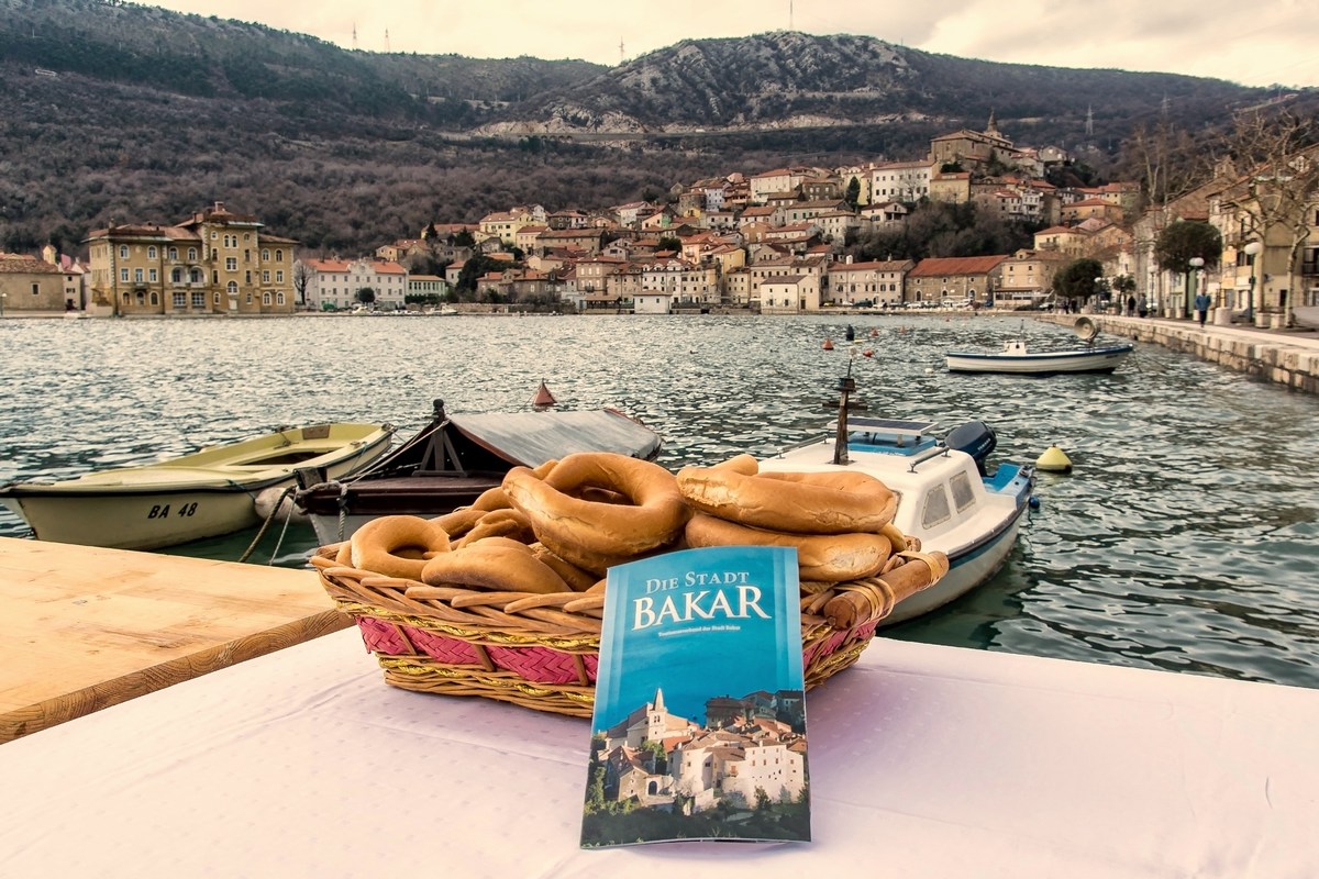 11. Bakarski baškot je značilen, dvakrat prepečen, pekarski izdelek. Baškot so mornarji radi vzeli na dolga potovanja, to okroglo, obročkasto »pecivo« pa so shranjevali kar tako, da so ga obesili kar na vrv. O pomembnosti tega izdelka govori tudi dejstvo, da je baškot uradni spominek mesta Bakar.