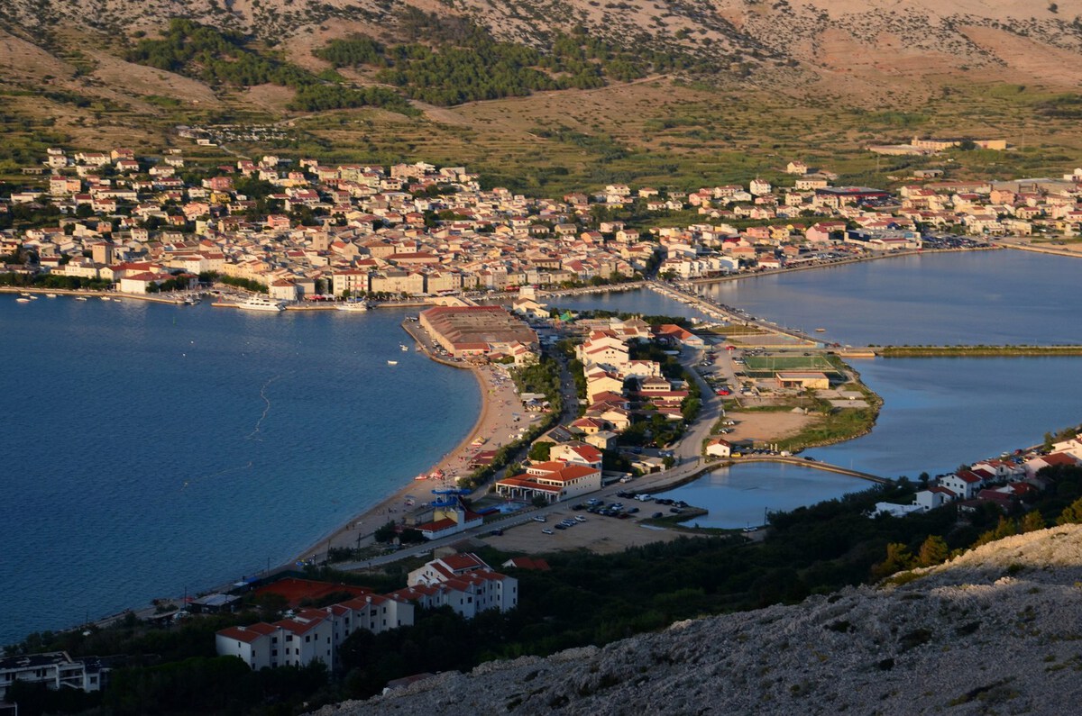 , ki je geografsko umeščen tam nekje v sredino tega istoimenskega otoka, leži na jugovzhodni obali Paškega zaliva, na področju kjer morje prehaja v plitek zaliv, v "slano jezero" imenovano tudi Paške soline.
