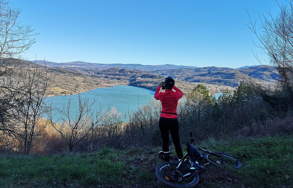 Po kratkem počitku nadaljujemo z vzponom, ki ga še ni konec. Zavedamo se, da bolj ko smo uživale v kolesarskem spustu od Grdosela do jezera, bolj moramo sedaj "trpeti v hrib". A v resnici ni nobenega problema, ko veste, da vas čakajo novi prekrasni razgledi. Nekaterih sploh ne pričakuješ, veselje pa je zato mnogo večje.