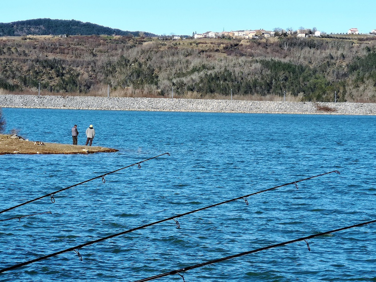 S kolesi smo se spustile vse do jezera. Zanimivo in drugačno je tukaj. Ne zadržujemo se, navsezadnje to ni promenada. Več ribičev lovi ob jezeru. Piha veter in spet je mrzlo, vemo pa, da se bomo po spustu in ravninskem delu ob jezeru prav pošteno ogrele, ko bomo kolesa gnale vse do Kašćerge.